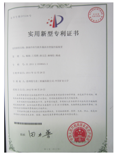2012年8月29日,徐州銳馬重工機械有限公司又有一項實用新型專利獲得中華人民共和國國家知識產權局的審批通過。該項目由我公司與中國礦業大學聯合研究,專利權由雙方共有。