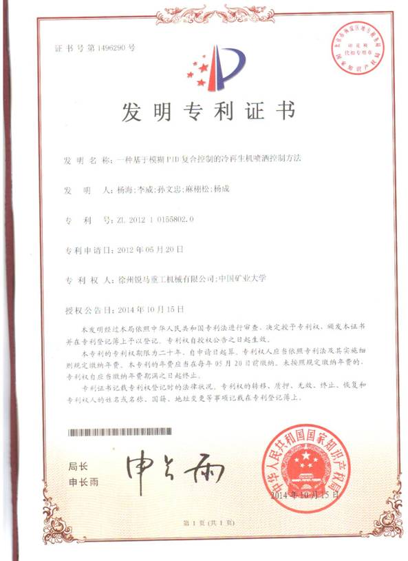 新獲國家批準的專利名稱為:一種基于模湖PID復合控制的冷再生機噴灑控制方法,該發明專利由我公司與中國礦業大學聯合開發,專利權由雙方共有。該項專利早已在我公司生產的路面冷再生機上獲得應用。路面冷再生機的添加劑噴灑控制系統的精確與穩定對冷再生施工質量有著決定性的影響,對于有經驗的路面冷再生行業人士來說是深有體會。我公司冷再生機噴水系統具有計量準確,流量穩定的特點,深受廣大用戶的好評,這是我公司堅持走技術創新,掌握了核心技術的結果。得益于持續不斷的技術創新,我公司冷再生機產品在技術水平上已處于國內領先地位,產品銷量也迭創新高,同樣國內領先。堅持技術創新,保持產品性能優勢是徐州銳馬重工一貫的宗旨,與進口機械一爭高下,促進國內路面冷再生事業的健康發展是徐州銳馬重工不變的目標。